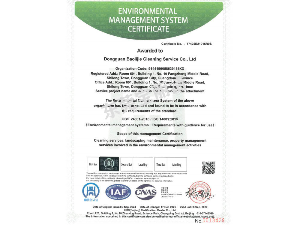 寶麗潔環(huán)境管理體係認證書